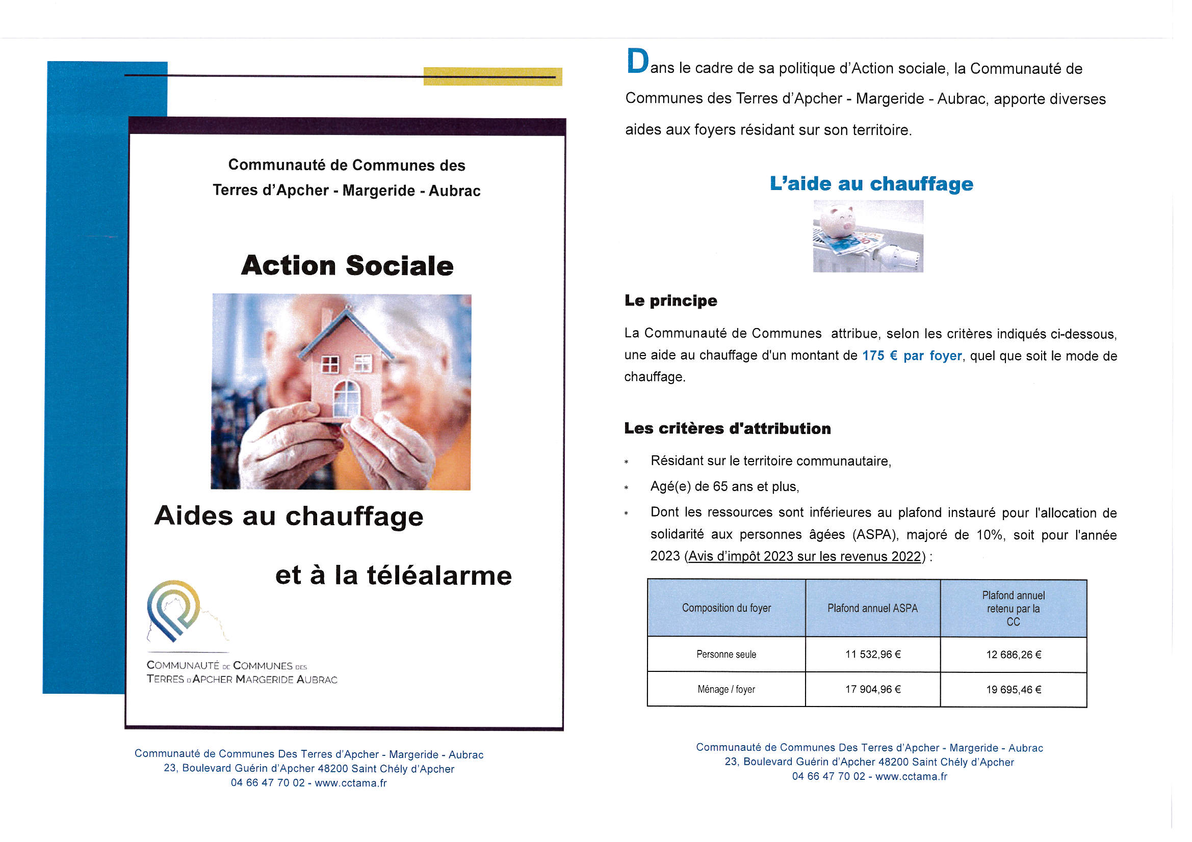 Dans le cadre de sa politique d’action sociale, la Communauté de Communes des Terres d’Apcher-Margeride-Aubrac attribue une aide au chauffage d’un montant de 175 euros par foyer composé de personnes de 65 ans et plus et résidant sur le territoire communautaire sous conditions de ressources.