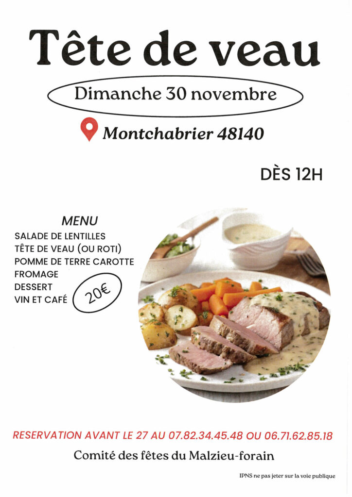 Dimanche 30 novembre 2025 c’est tête de veau au Montchabrier. Organisé par le comité des fêtes du Malzieu-Forain n’hésitez pas vous inscrire pour passer un bon moment😉 Réservation au 07 82 34 45 48 ou 06 71 62 85 18.